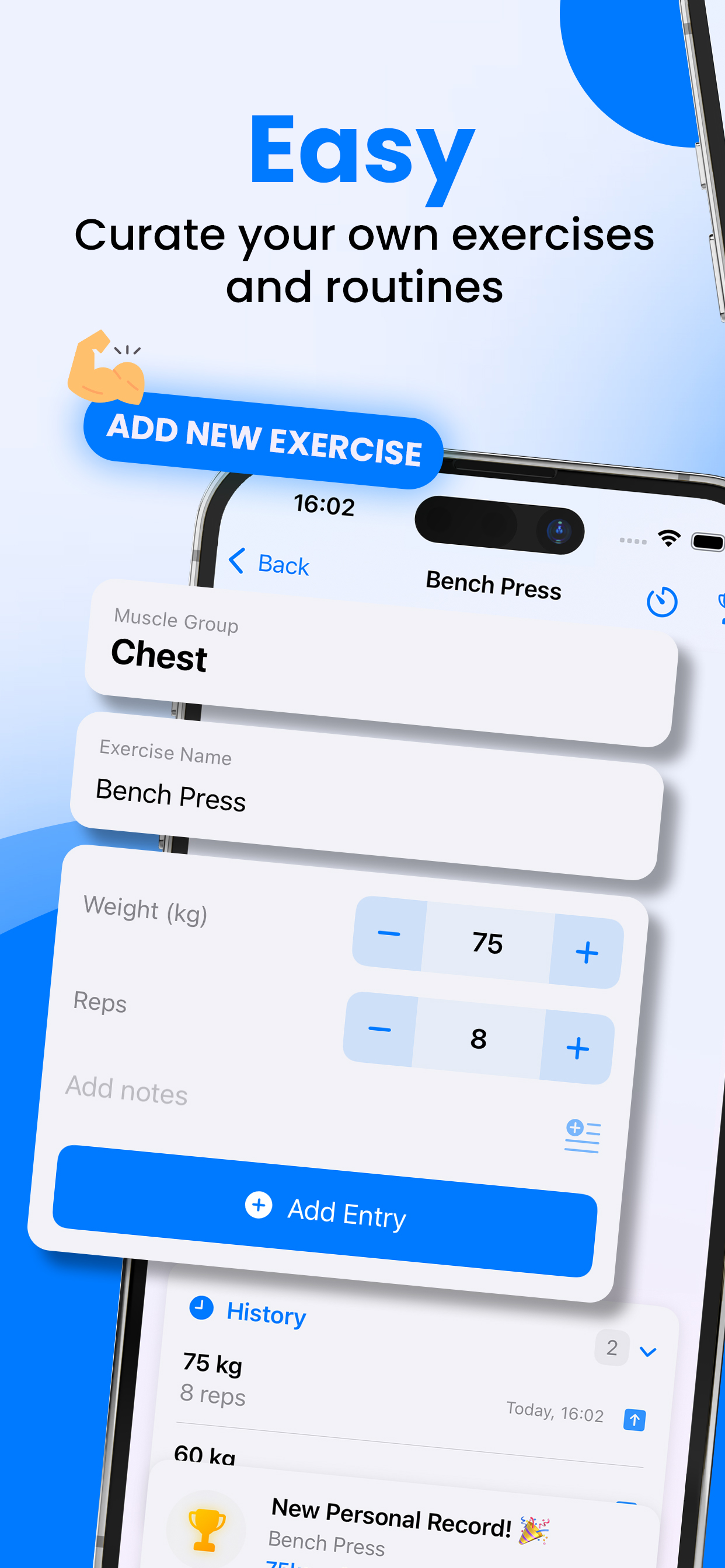 Save your go-to exercise combinations and load them with one tap. Perfect for push/pull/legs or any split you prefer.